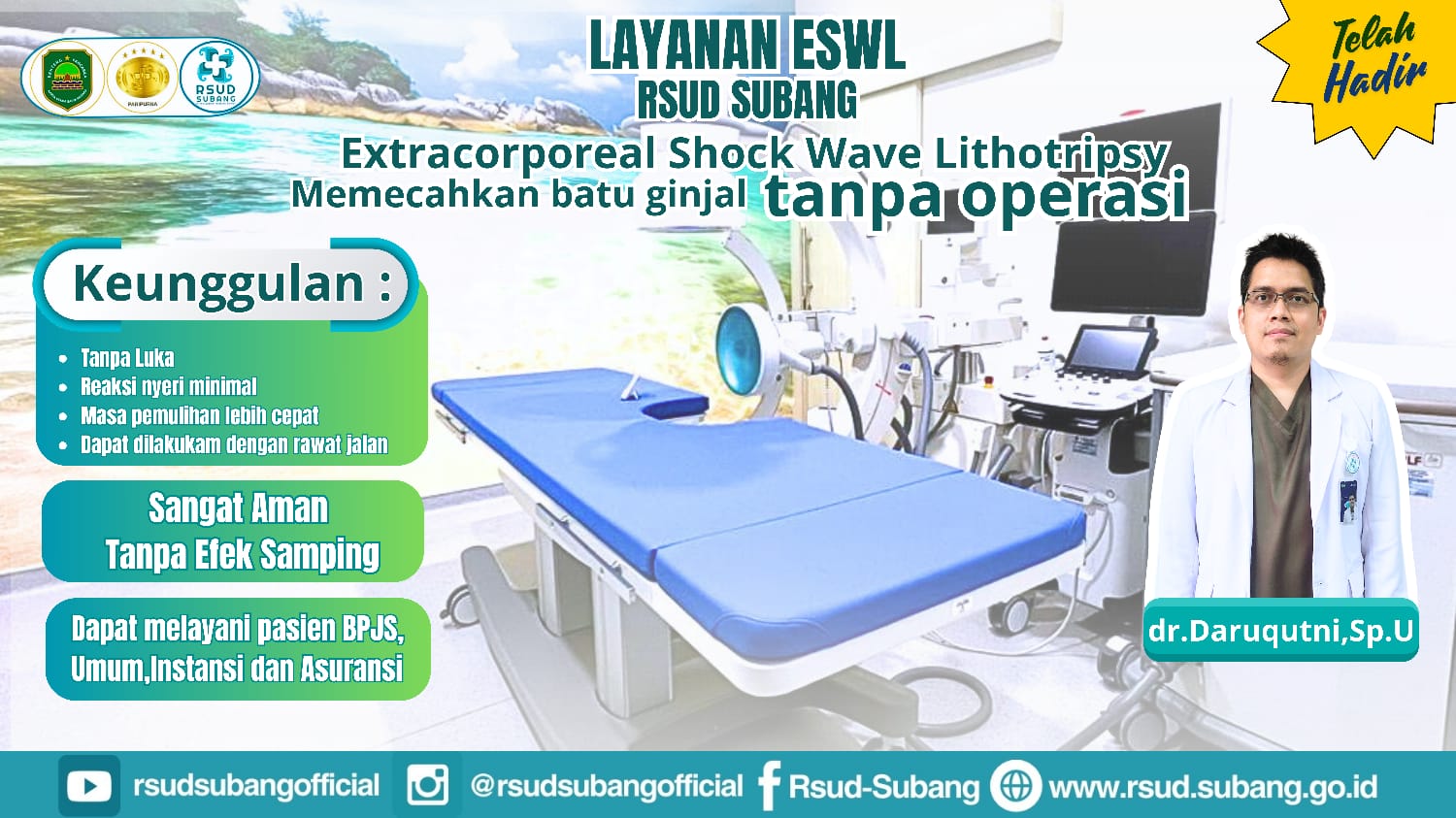 Pengumuman Layanan ESWL Mulai tanggal 9 September 2024, layanan ESWL (Extracorporeal Shock Wave Lithotripsy) resmi dibuka di RSUD SUBANG. ESWL adalah teknologi canggih yang digunakan untuk memecahkan batu ginjal tanpa operasi. Prosedur ini cepat, minim rasa sakit, dan memiliki waktu pemulihan yang singkat.